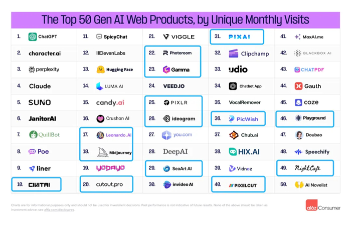 a16z Top50 Web 端 AI 产品流量榜单中有