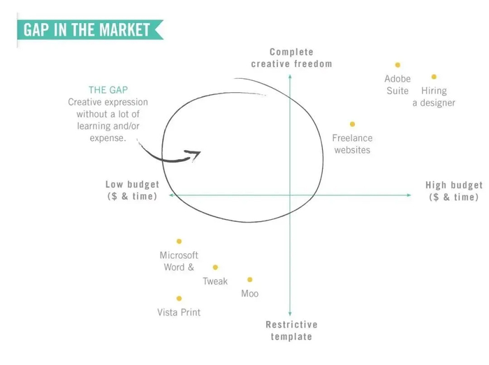 参见坐标系,Canva 与上两款产品最主要的差异就是“非专业”的定位,一言以蔽之,Canva=海量模板+简易编辑。