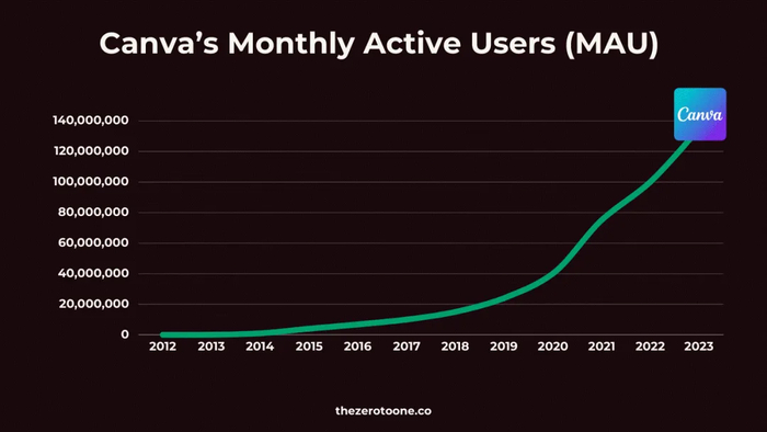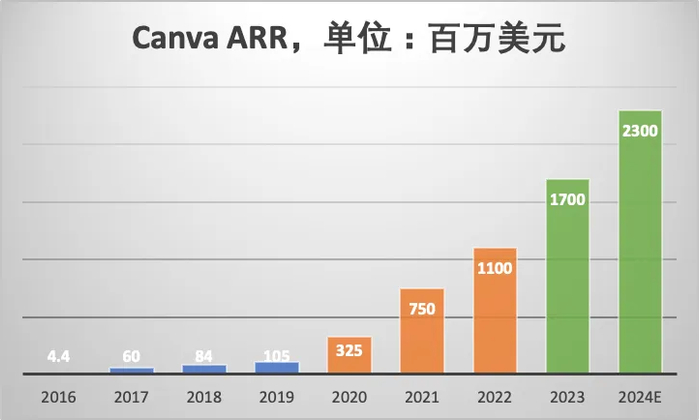 从 Canva 的 MAU 和 ARR 数据可以看到,从 2018 年 Canva 集中扩充使用场景开始,Canva 用户量与营收的增长也走上了快车道,2023 年的 ARR 已经达到 17 亿美元,3 年时间增长超 5 倍。