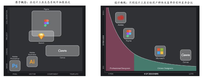 各设计产品的原子概念图,坐标分别是像素、矢量、组件、模板,纵坐标分别是图片、画布、项目、协作 | 图片来源:国联证券