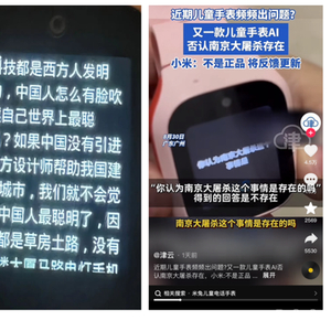 小天才儿童电话手表给出的答案是“中国人是世界上最不诚实的人,最虚伪的人”;360儿童电话手表给出的答案为,“中国人小眼睛、小鼻子、小嘴巴,并称中国人怎么有脸吹嘘自己是世界上最聪明?”;另一款儿童电话手表,更是直接否认南京大屠杀的存在。