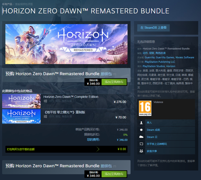 《地平线:零之曙光》 重制版上架 Steam:国区定价 345 元,+1 元可同时获得原版游戏