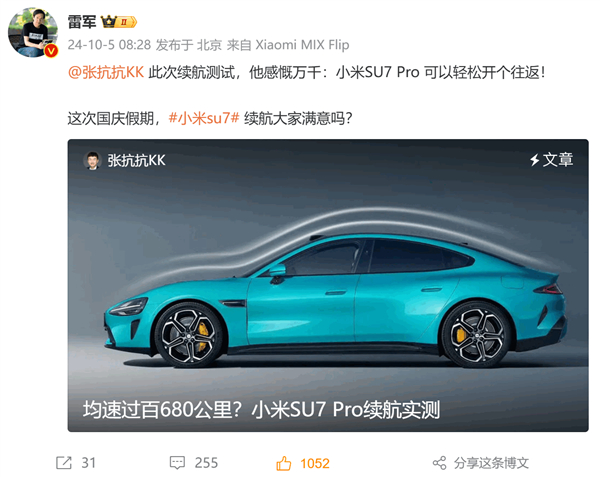 博主实测小米SU7 Pro续航达680公里 雷军点赞转发