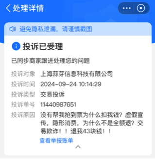 这位消费者在黑猫平台表示,“10月6日当天上午,智行火车票把后半程(洛阳龙门至武汉)的票款退回来了,但是抢票保障费195元(5人*39元)没退。跟官方平台沟通,反映只能退5元现金和两个平台消费券,对我没有任何用处。”