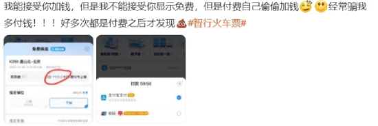 “智行好坑,下单的时候顺带给选附加产品扣钱,要不是我复盘了一下找客服退,一百多就偷偷扣除了……”“我能接受你加钱,但是不能接受你显示免费,但是付费自己偷偷加钱”“12306上119元的票它卖124元,然后莫名其妙的有多收我25元,根本没有明码标价写出来,关键是还退不了。”多位消费者在网络社交平台吐槽自己被智行悄悄收费的遭遇。