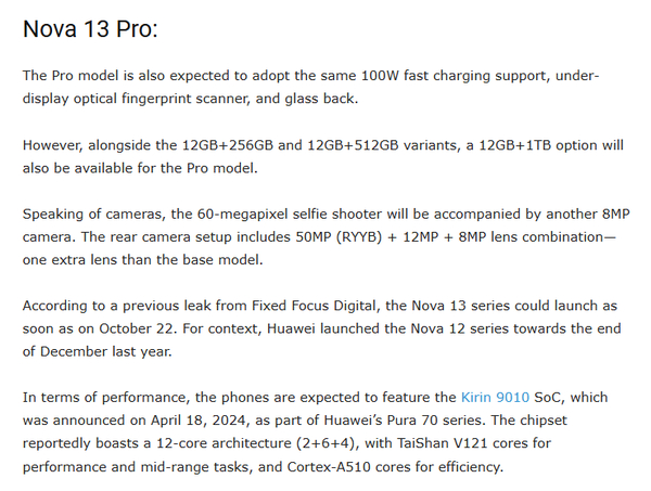 【CNMO科技消息】根据CNMO了解到的爆料,华为大概率于本月发布nova 13系列机型,具体的发布会时间暂未官宣,但关于华为nova 13系列的配置已经有大量爆料流出。
