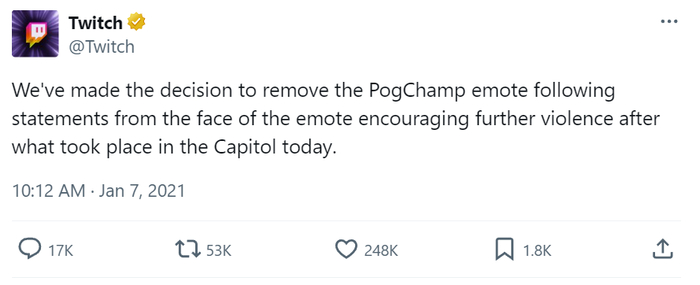 早在2021年,Twitch就有过下架PogChamp表情的先例。