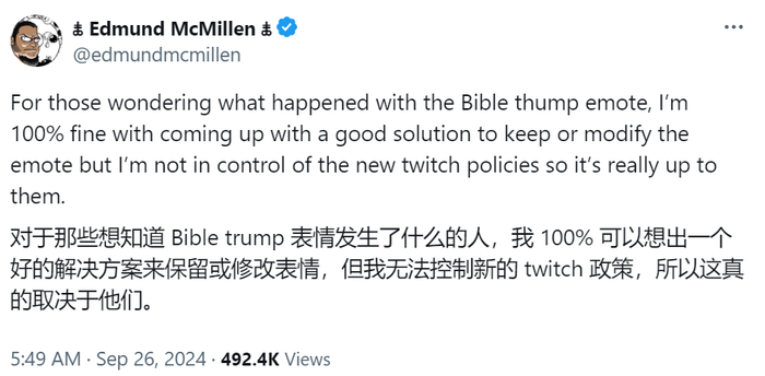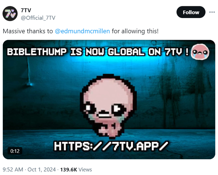 原作者Edmund McMillen找到了替代方案,跟 FrankerFaceZ和7TV这两个表情包工具合作,让BibleThump在插件里回归Twitch。
