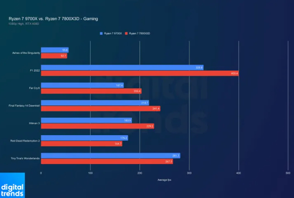 Zen 5芯片在生产力任务和单核性能上表现优异,但在多数游戏场景中,这些因素的重要性相对较低。将游戏处理器佼佼者Ryzen 7 7800X3D与Ryzen 7 9700X进行对比,前者在单核性能上落后约20%。然而,在游戏表现上,两者各有千秋。在部分游戏中,两者性能相近,但多数情况下,上一代CPU表现更佳,特别是在《F1 2022》这款游戏中,Ryzen 7 7800X3D以18%的显著优势领先,达到400帧每秒,而Ryzen 7 9700X则最高达到328 FPS。