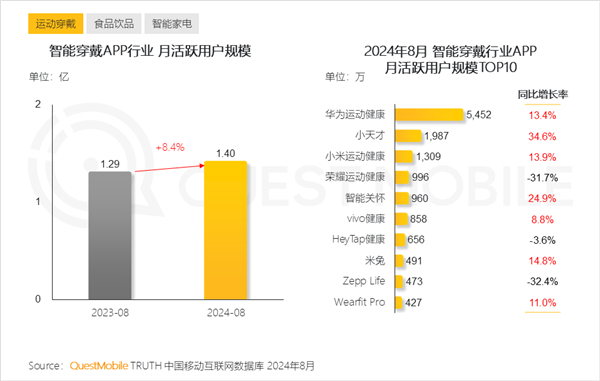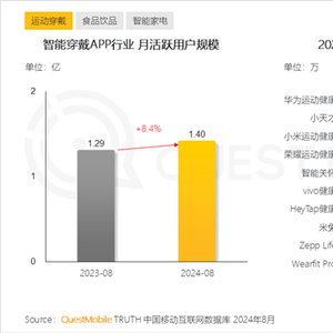 快科技10月9日消息,根据QuestMobile的最新数据,2024年8月,智能穿戴APP行业的用户规模实现了8.4%的同比增长,达到了1.40亿。