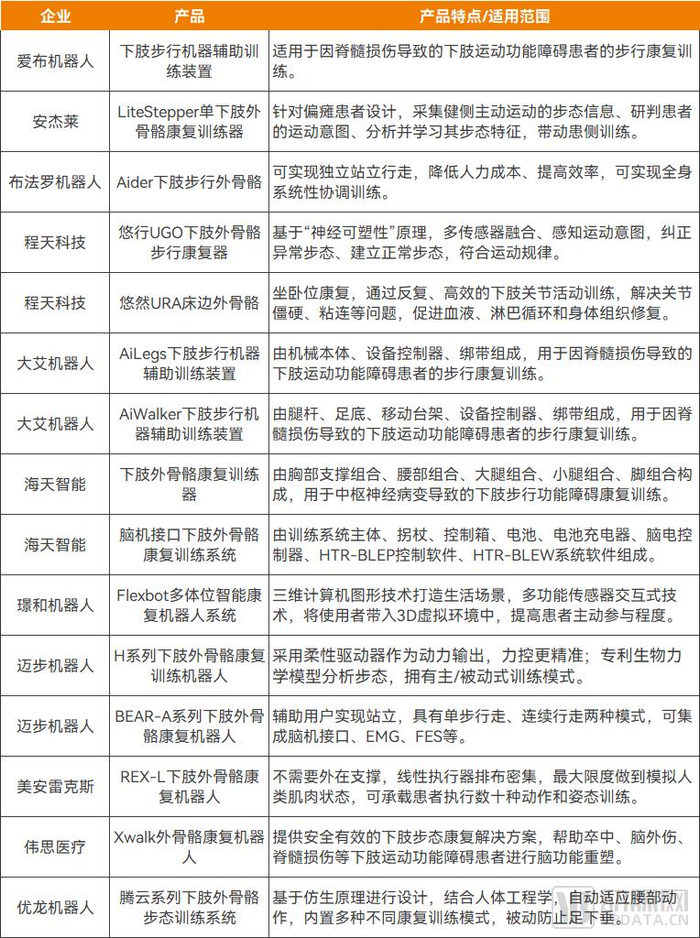 造成运动功能障碍的原因众多,患者所需的治疗方式不一。以下肢外骨骼机器人为例,产品主要是辅助患者进行站立及行走,动力关节主要是髋、膝和踝,让髋关节实现屈曲伸展,膝关节实现屈曲伸展,踝关节实现背屈和跖屈。整体来看,下肢外骨骼康复机器人主要起到了步态矫正、增强助力、运动代偿等作用。 步态矫正方面,下肢外骨骼机器人在康复医疗机构已有大量应用,其主要特点在于拥有多个主动关节,以及先进的传感和意图识别技术。这类设备专注于步态的矫正,同时避免二次伤害和机器刚性摩擦,其设计核心在于准确识别患者的运动状态,并提供安全的矫正力。 这些产品中,程天科技推出的悠行UGO康复外骨骼适用于脊髓损伤、脑卒中、下肢肌无力或其他神经系统疾病导致下肢运动功能障碍患者;产品基于“神经可塑性”原理,多传感器融合、感知运动意图,纠正异常步态、建立正常步态。 安杰莱的LiteStepper单下肢外骨骼康复训练器则专为偏瘫患者设计,辅助偏瘫患者针对患侧下肢进行康复训练。产品采集患者健侧主动运动的步态信息、研判运动意图、分析并学习其步态特征,带动患侧进行与健侧相适应的运动再学习康复训练。 迈步机器人的H系列下肢外骨骼康复训练机器人以专利技术柔性驱动器作为动力输出,并通过特有专利技术动力踝关节提供背屈助力,在助力下重复练习屈、伸动作,纠正足下垂和足内翻的问题,提升平衡能力,纠正异常步态。 增强助力方面,产品主要在于帮助那些由于肌力不足而行动不便的老年人,特别是能够独立行走而无需外部支撑的患者;针对肌力退化的老年人或骨折后康复患者,其设计则需注重提供额外的力量支持。例如,傅利叶的ExoMotus M4可帮助各类型下肢运动障碍的患者在早期实现站立及步行功能训练,在康复早期给用户提供正确的感觉输入,抑制异常步态形成。 增强助力型产品的核心特性包括轻便性、长续航力和精准的步态识别能力,可采用轻型柔性外骨骼设计。 如司羿智能的EasyWalk下肢软体外骨骼帮助解决卒中患者、脑外伤等的行走障碍问题,产品采用了软体结构,仅重3kg,集中在腰部、易于穿戴,可避免传统刚性外骨骼强制用户行走的机械运动形式。 运动代偿方面,产品主要为完全或部分丧失运动能力的截瘫患者设计,通过设备的运动功能来代偿患者失去的行动能力。这类设备将安全性和稳定性作为设计首要,兼顾患者日常生活的运动需求,并力求模拟自然步态。 以布法罗机器人推出的Aider为例,产品能实现独立站立行走,可用于步态训练、下肢肢体运动训练、肢体协调性训练、力量训练、认知训练和姿态控制训练等,进行全身系统性协调训练,可针对脊髓空洞症、脊髓炎、脊髓损伤等导致的截瘫或四肢瘫的患者进行。 近年来,康复外骨骼机器人积极探索技术融合,促进产品升级迭代,并进一步提升产品的安全性、有效性和智能化。基于脑机接口的外骨骼系统将运动意图转换为外骨骼的控制信号,使患者可以在外骨骼的驱动下执行运动,提供了更为丰富的感觉运动反馈,在结构和功能方面提高神经系统可塑性,实现意图-驱动闭环反馈,为下肢运动功能康复提供新的治疗策略。 虚拟现实及增强现实技术或可创造沉浸式虚拟环境,或可将虚拟世界与现实环境叠加,二者由此成为数字世界与真实场景的连接纽带;运用到外骨骼康复中,则可将康复训练系统融入真实环境,为用户带来真实、多样化的交互体验,尤其适合在家庭康复场景、没有康复治疗师干预的情况下使用。 此外,随着近年来人工智能技术的不断进步,人工智能也已应用于外骨骼机器人,帮助患者进行功能性行走和步态训练、进行外骨骼的安全性、耐受性和行走功能功效评估,可进行深度学习的智能机器人研发已成为必然趋势。如爱布机器人研发了基于人工智能算法的智能外骨骼机器人,专业化训练模式,帮助患者实现神经系统整体康复。 因此,脑机接口、人工智能、虚拟现实及增强现实等前沿技术逐步融入外骨骼机器人研发制造,使得外骨骼机器人更能从真正意义上成为一套穿戴在身体外部,能够与使用者协调或平行工作,以增强身体素质和完成既定动作为目的的智能设备。03 应用空间开拓,产品能否普及到“人均”一套?总的来说,随着我国人口老龄化进程加深,在康复护理资源整体不足的背景下,外骨骼康复机器人可在医疗机构内助力老年人康复效率和质量的提升。随着延迟退休等一系列与老龄化相关的政策落地,老年人对来自行动能力的功能康复更加重视,行业机遇进一步扩大。在这一趋势下,外骨骼机器人的应用场景正加快从医疗机构延伸至家庭,在康复中后期使用,或作为日常助行工具使用,以帮助患者更好地恢复功能、回归社会、预防复发。目前,多家企业已布局居家康复型的外骨骼机器人、消费级助行设备,解决个人康复训练、日常行走等问题。其中,程天科技推出了悠行UGO康复外骨骼个人版,适用于社区和家居场景的个人康复使用,设备采用机械固定和绑带保护设计,可根据使用者的身体参数进行手动刻度调节,操作简单,非专业人员在学习后即可协助穿戴者使用。 新松机器人的下肢外骨骼训练器在用户与专业医生或治疗师定期沟通下,也可用于居家场景,帮助偏瘫患者激发患侧肢体主动参与能力,提高日常生活水平;并帮助患者纠正异常步态和足