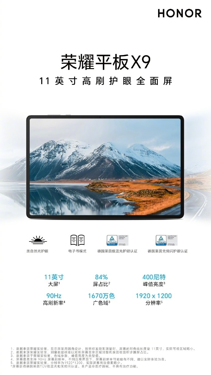 除了荣耀平板GT Pro之外,荣耀还公布了全家都爱用的荣耀平板X9,搭载11英寸高刷护眼全面屏,支持电子书模式,同样通过了德国莱茵无频闪和低蓝光认证,可以达到80天超长待机。