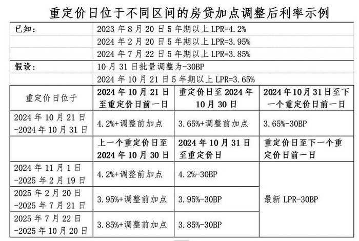 假设2024年10月31日进行批量调整,假设2024年10月21日报出的5年期以上LPR跟随央行政策利率下降0.2个百分点,由当前的3.85%降至3.65%,后续保持不变。举例来看: