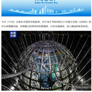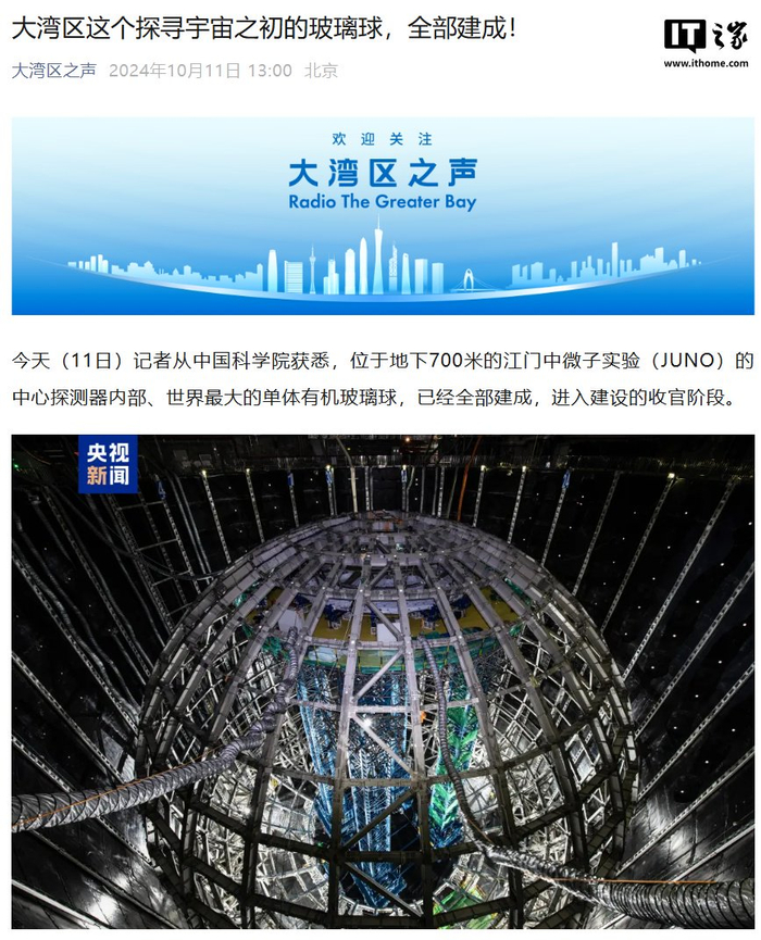 IT之家 10 月 11 日消息,据中央广播电视总台“大湾区之声”今日报道,位于地下 700 米的江门中微子实验(JUNO)的中心探测器内部、世界最大的单体有机玻璃球,已经全部建成,进入建设的收官阶段。