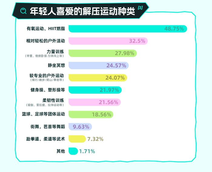运动同样是年轻人解压的常用方式。调研发现,31%的年轻人通过运动健身来消解压力,其中65%的人每周至少运动几次,27%的人每天都保持运动。有氧运动、燃脂运动、公园散步、力量训练、静坐冥想、攀岩等都是年轻人喜欢的运动方式。不同群体有不同的爱好:女生更喜欢独自运动,而男生则更喜欢找好友一起运动。00后最不喜欢一个人运动,他们更喜欢和朋友一起运动,因此篮球、街舞等团体性运动成为了他们的最爱。