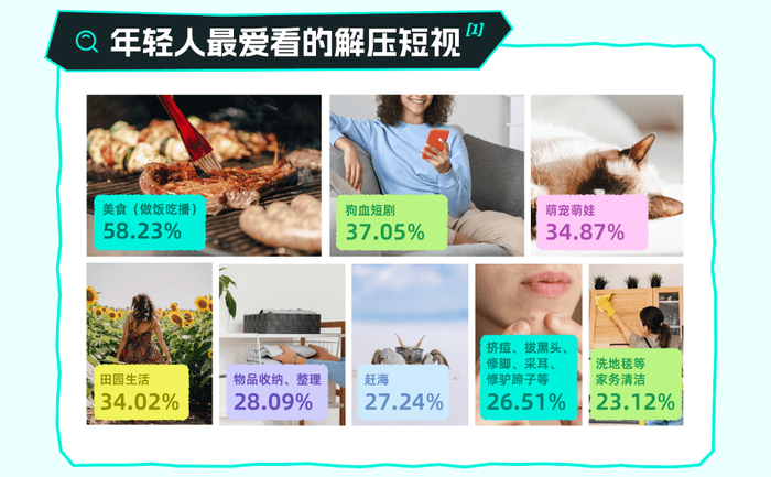 具体来看,在娱乐休闲上,美食和“霸道总裁”类视频成为了年轻人喜爱的解压内容。在刷短视频时,美食吃播、狗血短剧、萌宠萌娃等内容往往能够吸引年轻人的注意力,帮助他们暂时忘却烦恼。此外,不同年龄段的人有不同的喜好:年轻的00后们爱看美食吃播和萌宠萌娃视频;而35岁以上的人则更偏好狗血短剧和田园生活的视频。