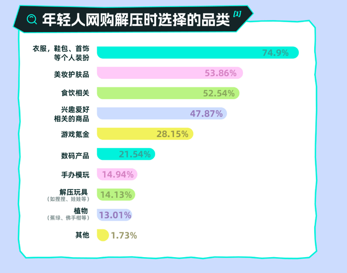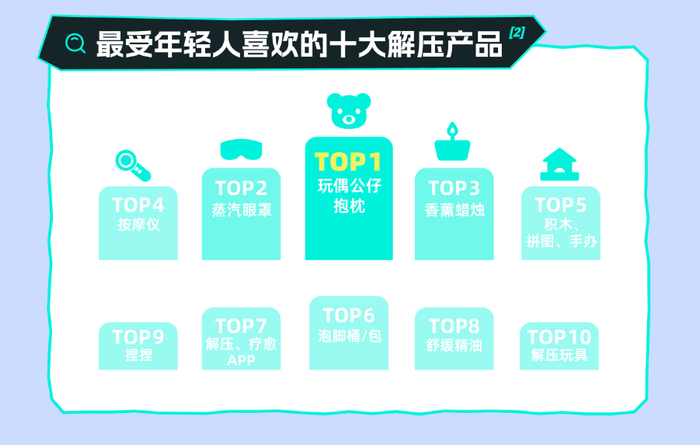 报告还揭示了年轻人多元方式解压。比如,34.7%的年轻人会通过消费来解压,其中九成的人选择网购。从玩偶公仔到蒸汽眼罩,再到各式各样的解压玩具,这些商品成为了他们暂时摆脱现实困扰的精神寄托。值得一提的是,00后更偏爱那些能提供情绪价值的产品,如捏捏、玩偶抱枕等,而年纪较大的受访者则倾向于实用性强的产品,如按摩仪、舒缓精油等。