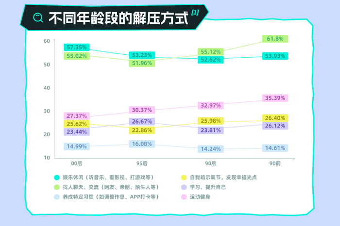 为应对这些压力,年轻人采取了多种多样的解压方式。报告显示,社交和娱乐休闲成为了他们消解压力的主要途径。不同年龄段的年轻人有着不同的解压偏好:
