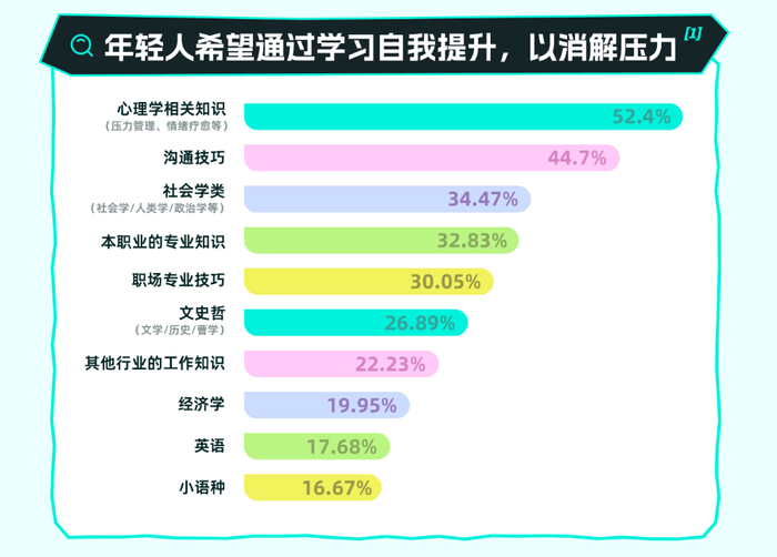 从调研数据来看,心理学是最受欢迎的学习类型,这几年转入心理学领域的人也越来越多。这是因为心理学相关知识(如压力管理、情绪疗愈等)能够直接帮助年轻人更好地理解和应对自己的情绪问题。同时,社会学类(社会学 / 人类学 / 政治学等)知识也受到一定程度的欢迎,这些知识可以帮助年轻人更好地理解社会现象,从而在复杂的社会环境中找到自己的定位,缓解因社会压力带来的迷茫感。