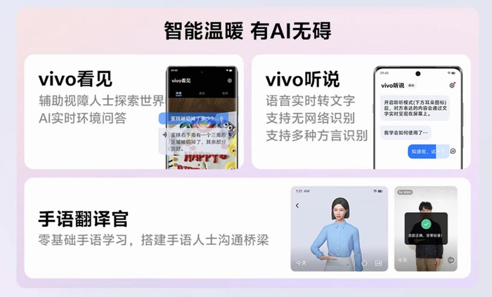 vivo长期致力于信息无障碍的发展与创新,以AI技术助力无障碍环境建设。早在2018年,vivo就成立了vivoAI全球研究院,基于在AI领域的探索实践,vivo将AI创新技术延伸到视觉、听觉、语言等层面,以多模态大模型等前沿科技成果赋能无障碍领域,支持障碍人士更好地自强自立,融入社会。