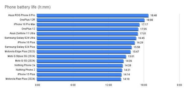 测试结果显示,这些大容量电池的手机续航时间非常长。例如,iPhone 16 Plus和三星S24 Plus分别以16小时29分钟和15小时58分钟的成绩位列排行榜上。