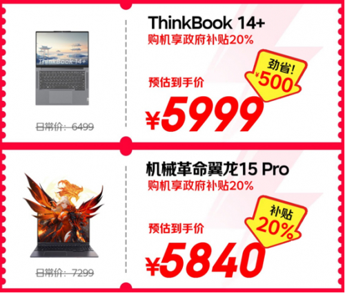 无论办公还是电竞,换新一台前沿的笔记本电脑产品都能让生产力快速提升。例如京东价10999元的联想拯救者Y9000P游戏本和京东价5840元的机械革命翼龙15 Pro就在颜值、性能、AI能力方面为电竞爱好者提供了流畅的游戏体验,下单这两款产品还可享受政府补贴20%的优惠措施。ThinkBook 14+则能基于前沿的AI能力帮助职场人获得事半功倍的工作体验。京东价5999元,同样可享政府补贴20%的福利。