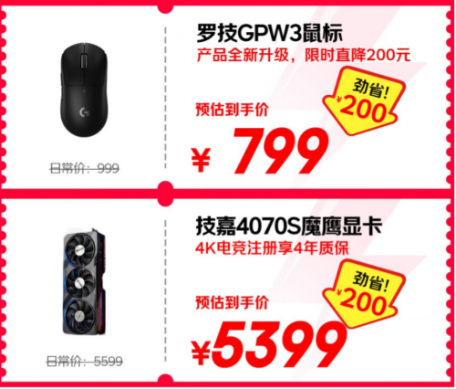 换新电脑之后,注重电脑使用体验的消费者也可趁着11.11的购物优惠在京东入手售价799元的罗技GPW3鼠标和京东价5399元的技嘉4070S魔鹰显卡,让自己的装备更加全面,其中在京东入手技嘉4070S魔鹰显卡还有注册享4年质保的可靠服务。