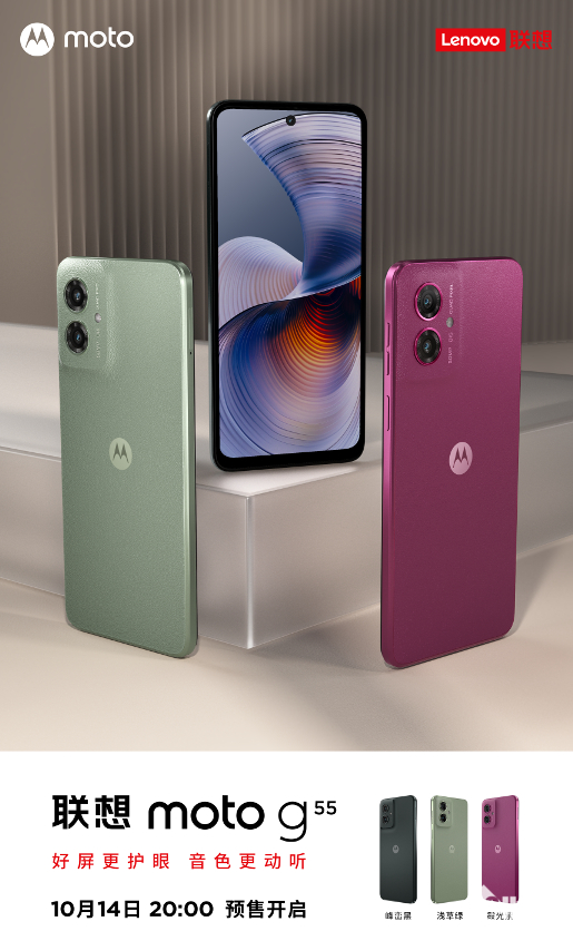 10月14日,全新系列手机产品联想moto g55正式开启定金预售,10月21日现货开售。其中,8GB+128GB版本售价1299元,8GB+256GB版本售价1399元。