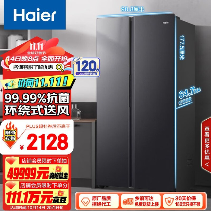 海尔 BCD-521WGHSSEDSD 风冷对开门冰箱,到手价1894元