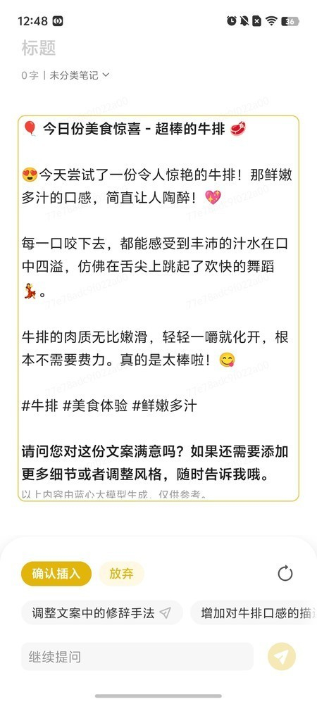 今年小V也来到了输入法中,只需点击左上角的“AI”按钮即可激活。全新的小V写作可以帮助我们续写、润色文字,也能帮助我们撰写商品评价、小红书文案等等,可以说vivo X200系列的输入法也变得更加智能,更能满足我们的日常所需。