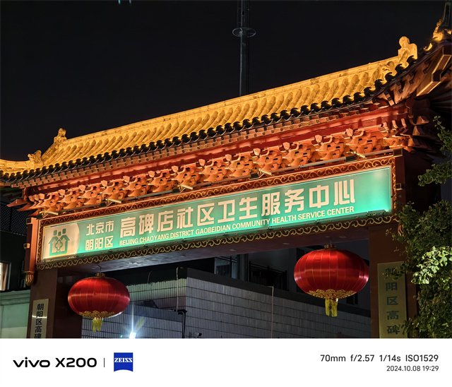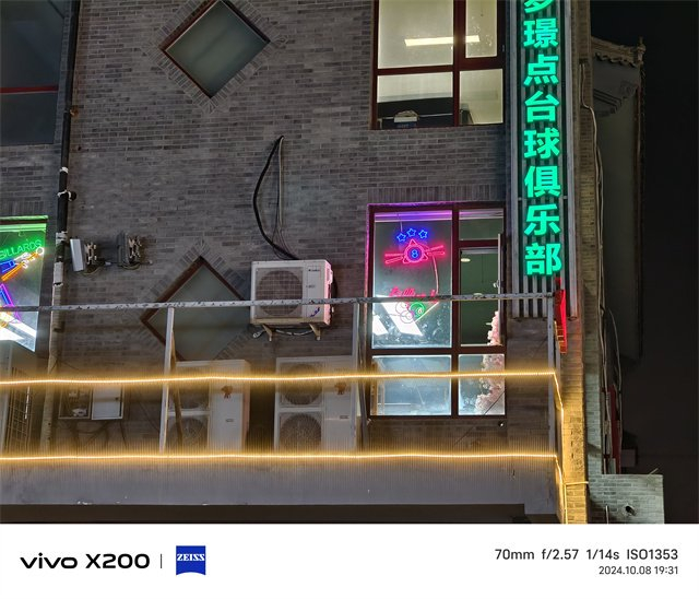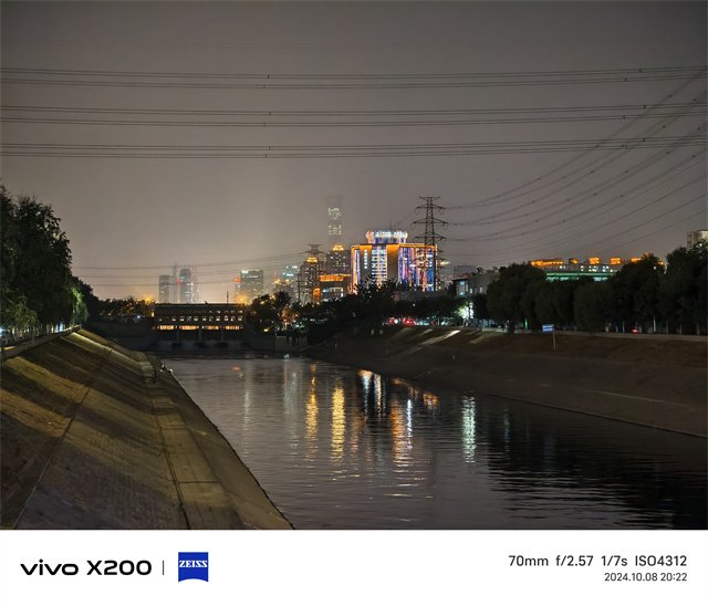 夜景方面,vivo X200处理的也非常的具有蓝厂味,对于高光的压制比较不错,画面也是比较纯净的,噪点控制的相当好,不过拍摄当天的天气不是很好,拍摄出来的灯光有些炫光,不过整体能够看出效果还是令人满意的,即使长焦的镜头能看出对于高光的压制做的非常到位,画面也是非常通透的。