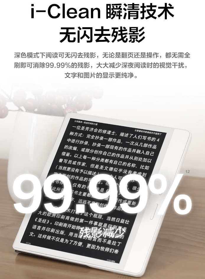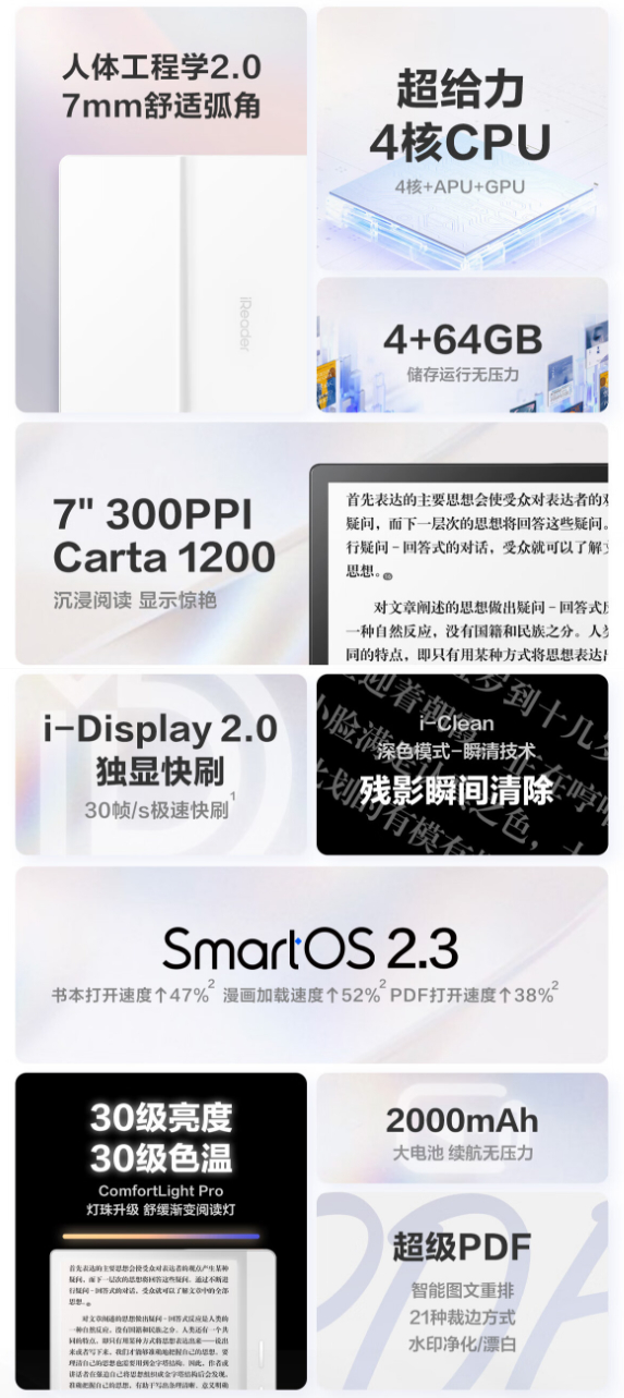 据介绍,iReader Ocean 4 Turbo 搭载 2.0Ghz “四核”处理器,配备 7 英寸 Carta1200 屏幕,像素密度300PPI ;支持 i-Clean 瞬清技术,深色模式场景下刷新模式为高清时,可消除 99.99% 的残影。