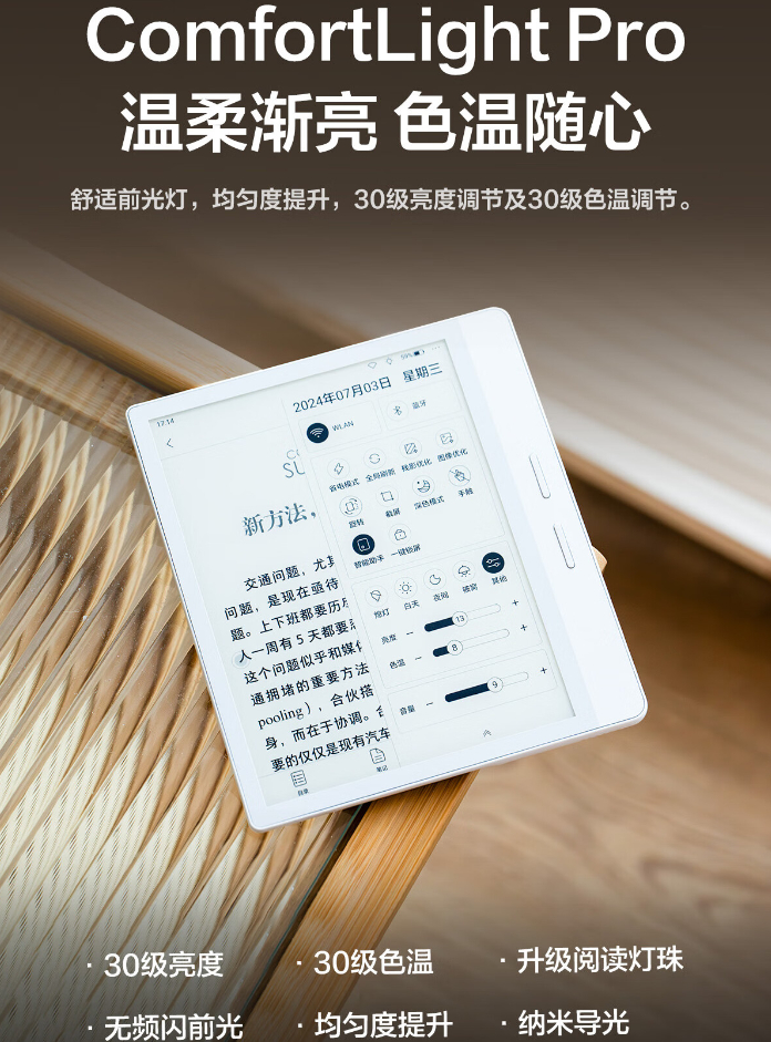 该款电纸书配备 ComforLight Pro 渐变阅读灯,提供 30 级亮度、30 级色温调节;电纸书内置 2000mAh 电池,官方宣称阅读时长 49 小时,待机时长 20 天。