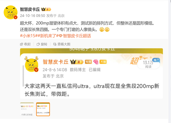 【CNMO科技消息】尽管小米官方尚未正式宣布小米15系列的发布日期,但市场普遍预测该系列将于10月底面世。小米15系列预计包含三个版本:15标准版、15 Pro和15 Ultra,其中前两个版本会率先登场,而旗舰级的15 Ultra则预计要等到明年2月才发布。10月16日,博主“智慧皮卡丘”透露,小米15 Ultra将配备一颗体积较大的2亿像素潜望长焦镜头,因此正在测试新的摄像头排列方式,但整体设计仍将保持圆形模组,并继续采用双长焦四摄方案,其中一个镜头特别针对人像摄影进行了优化。
