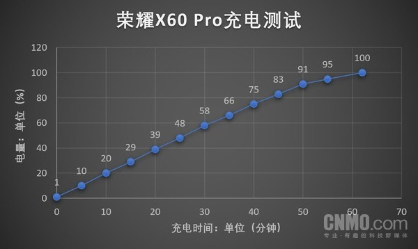 快充方面,荣耀X60 Pro这一次带来了66W超级快充,从测试来看,10分钟充电20%,30分钟充电58%,充电至100%耗时62分钟。相较于上一代的X50速度快了30分钟左右,对于一块这么大的电池来说,速度相当可以。大电池搭配超级快充,也使得用户在日常使用时,充电5分钟、10分钟也能获得不错的续航,出门不至于电量焦虑。