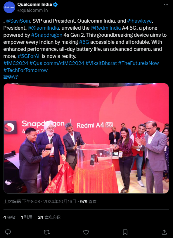 小米手机进入印度市场 10 周年:Redmi A4 5G 发布,全球首发高通骁龙 4s Gen2