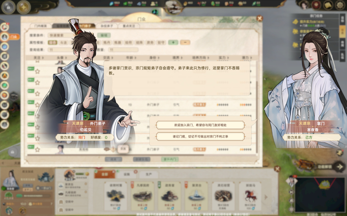 既有传统修仙游戏的那套开宗立派、修仙证道,也有4x游戏核心的那套“扩张、探索、技术、消灭”。玩家扮演的掌门要带领弟子凝神魂、结金丹,化神登仙,同时也要操心宗门上下的各种杂务:跟弟子谈心,派遣队伍探索,打理麾下的州府,操心与其他宗门的外交等等,繁多的游戏内容足以让玩家不知不觉间玩到天色泛白,而这也是游戏的最大问题。4X游戏与门派经营游戏单独拎出来看,两个游戏类型的操作都比较繁琐,单局游戏时间过长,而《宗门志》将其结合的时候似乎也没有找到一个好的取舍。
