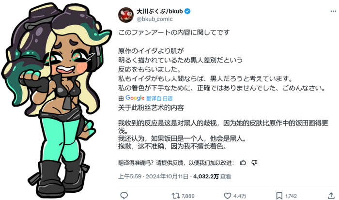 再往行业中的其他地方看去,《刺客信条 影》引起的争议已经不用多说,而同样就在前几日,《pop子和pipi美》的作者大川ぶくぶ为《斯普拉遁》中的角色饭田画了一幅同人画,却遭遇一些批评,说他绘制的肤色明显要比原作中浅。