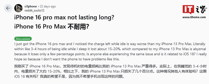 博文还指出,虽然主要是 iPhone 16、iPhone 16 Pro 系列用户反馈,但也有部分升级到 iOS 18 系统的旧款 iPhone 反馈存在相同续航问题。