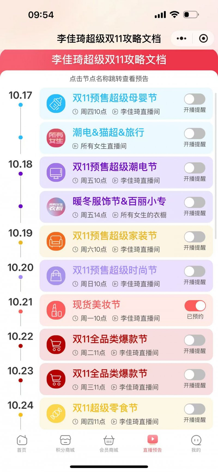 天猫在10月14日启动双11,李佳琦直播间依然延续往年传统,在当晚开启美妆节专场预售。根据李佳琦超级双11攻略文档直播预告,10月18日上午十点,将进行双11预售超级潮电节专场直播。