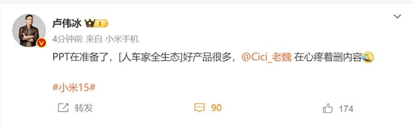 快科技10月20日消息,今天下午,小米集团卢伟冰表示,小米15系列发布会PPT正在准备中,因新产品很多,魏思琪正在删减一部分内容。