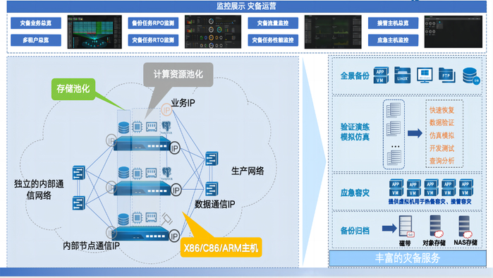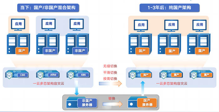 与此同时,国产化建设成为主旋律,“2+8+N”体系全面推广将高水平科技自立自强提升至战略决策。面对面对不可控的国际环境与国内信息安全需求,国产化替代成为关键,国产/非国产混合架构数据中心成为必经阶段。科力锐与时俱尽,发展一云多芯架构,可将X86、C86、ARM等不同架构主机任意组合,全面兼容适配国产CPU、操作系统、数据库及应用,为国产和非国产应用提供全景统一灾备全流程保护。该方案不仅可提供混合CPU架构容灾资源,而且在全面国产化时,只需将集群中的X86服务器替换成国产服务器即可实现灾备任务及历史备份数据的平滑迁移,无需中断保护和重做任务,保护投资,降低TCO。科力锐的这一创举,不仅是对国家战略的积极响应,更是对企业自身技术创新能力的深度挖掘与展现引领行业向自主可控的未来稳步前行!
