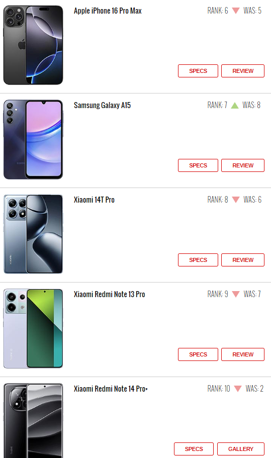 最后三个席位被小米手机占据。小米14T Pro凭借其出色的性能和高端的定位,位列第八。而两款中端手机Redmi Note 13 Pro和Redmi Note 14 Pro+则分别位列第九和第十。