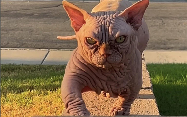 这种猫看起来很吓人,全身皮肤皱巴巴的,没有毛,就连对猫非常有用的长胡子也没有,肌肉发达,但腿短且弯曲。看起来非常彪悍,那种压迫性的气质,和恶霸犬很像。