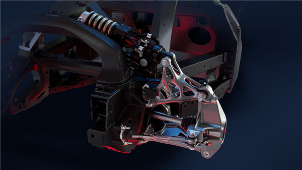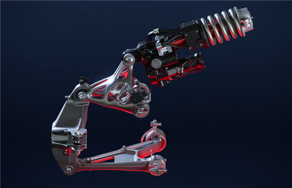 前后的铝合金副车架通过更轻的钛合金螺丝跟车身连接,后悬部分和布加迪陀飞轮类似,也采用了 3D 打印的镂空摆臂来减重。