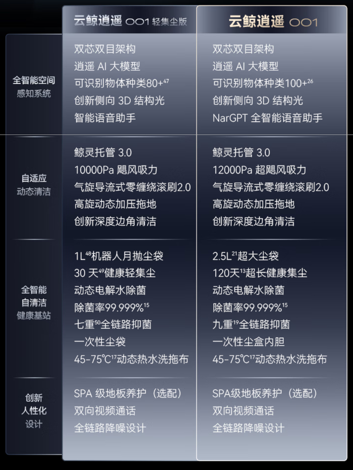 云鲸逍遥 001 搭载全智能空间感知系统,搭载双目摄像头、FOV 达 136°,每秒进行 150 万次空间点云计算,具备最小 5mm 识别精度,自研双芯架构算力可达 4TOPS。它还搭载逍遥 AI 大模型与 NarGPT 语音助手,支持超 100 种物体识别与简单、多意图、模糊意图、召唤清洁等多种语音交互。