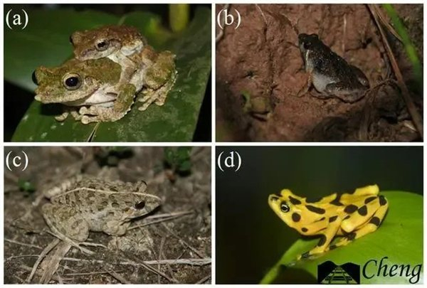 锯腿原指树蛙(a)、粗皮姬蛙(b)、泽陆蛙(c)和泽氏斑蟾(d)