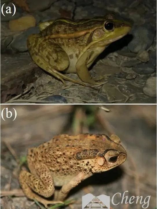 黑斑侧褶蛙和黑眶蟾蜍的皮肤差异明显