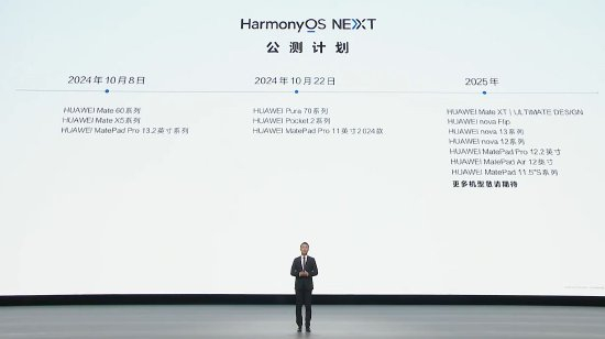 他表示,10月22日,纯血鸿蒙将开启华为Pura 70系列,华为Pocket 2系列和华为MatePad Pro 11英寸 2024款三款设备公测。华为Mate XT非凡大师、nova flip、nova13系列等更多设备将陆续在2025年加入公测。此外,华为还将为首批100万名公测用户提供公测权益,总价值超过500元。消费者可在我的华为App中“升级尝鲜”申请升级,抢先体验纯血鸿蒙带来。