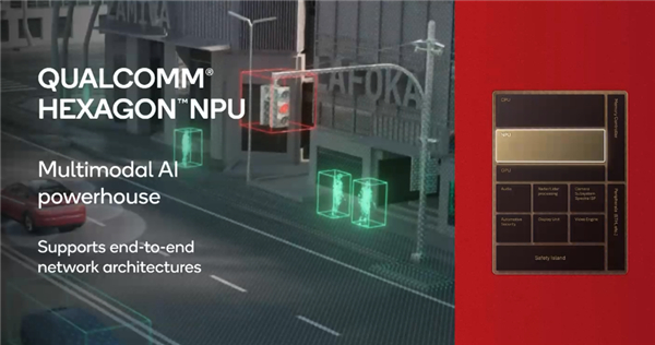 高通先进的NPU是支持多模态的强大AI处理器,专为智能驾驶进行了增强,能将多个摄像头和多模态传感器与SoC相连接。